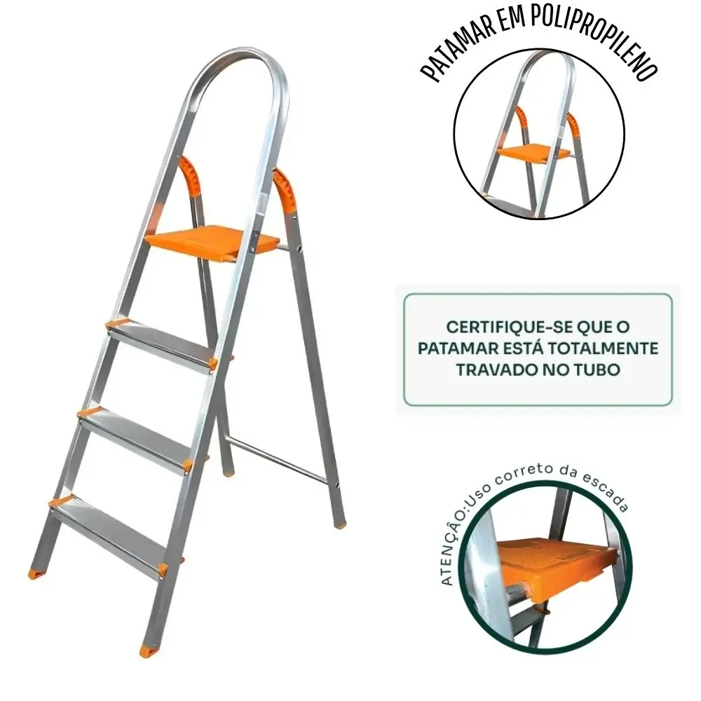 Escada De Alumínio C/ 4 Degraus Domestica – Detalhes Laranja